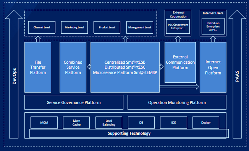 Sm@rtEMSP Enterprise Microservice Platform is a financial architecture software solution for the financial industry, with independent intellectual property rights, which offers more extensive and flexible reusable capabilities, concentrated/centralized management of basic platform components, and unified technical capability. The implementation of a unified microservice architecture technology solution helps avoid certain problems, such as repeated construction and resource waste occurred with the stovepipe architecture.